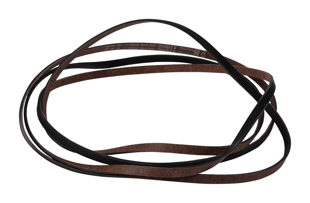 This OEM drive belt wraps around the dryer drum, idler pulley, and motor pulley to translate motor motion into drum rotation. Measuring 100″ long, 3/8″ wide, with a 5-rib, 4-groove profile, it ensures consistent drive and friction. A worn or broken belt commonly leads to a dryer that tumbles but won’t run—replacing it restores proper function.